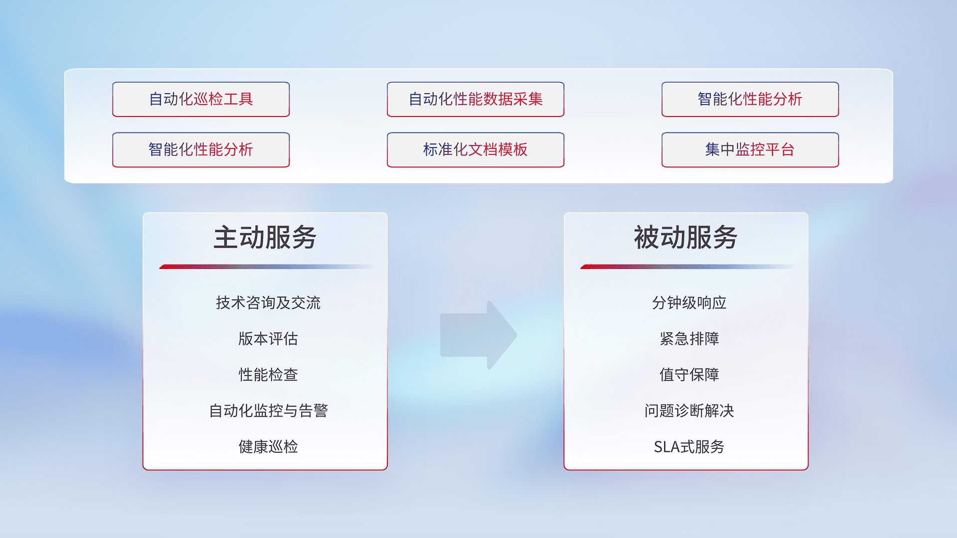 智能化工具和标准化文档,,,保障服务质量,,,提供主动服务(包含技术咨询、、版本评估、、、、性能检查、、、自动化监控与告警、、、、健康巡检)和被动服务包含(分钟级响应、、紧急排障、、值守保障、、问题诊断解决、、SLA服务)。。。。
